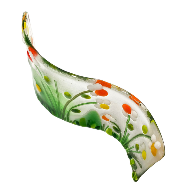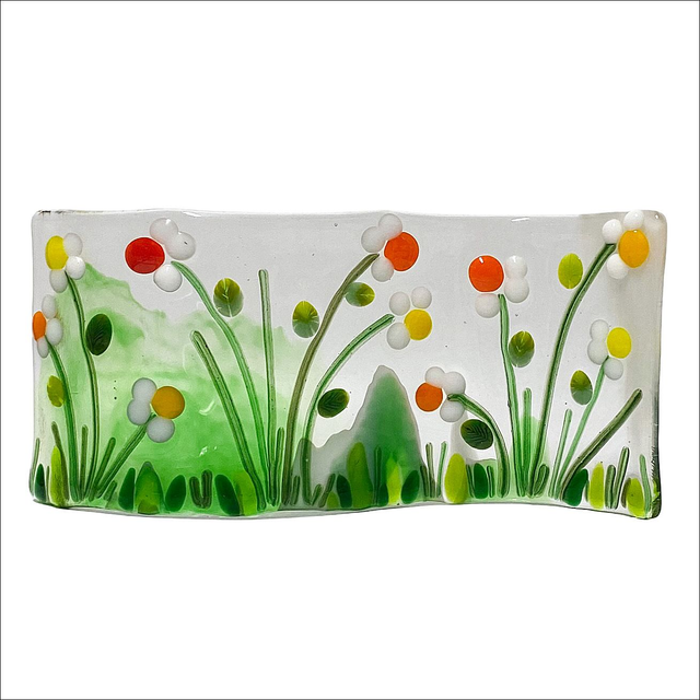 Waved shaped fused glass ornament with orange and white flowers in grass